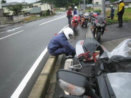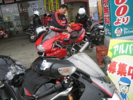 10:09 給油 & カッパ 友部のインターを降りて間もなく、とうとう雨が降り始めました。 笠間市のいつも立ち寄るスタンドに止まって給油、そしてカッパを着込みます。 |