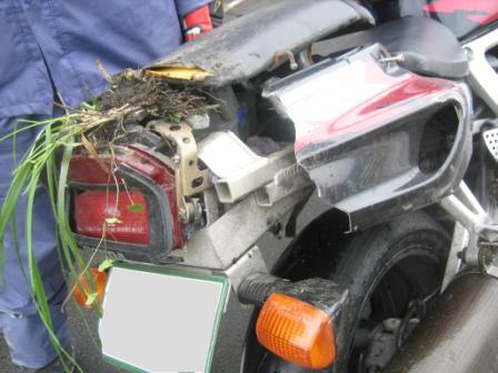 転倒して滑っていった先の草が割れたリヤカウルに生えちゃってました。