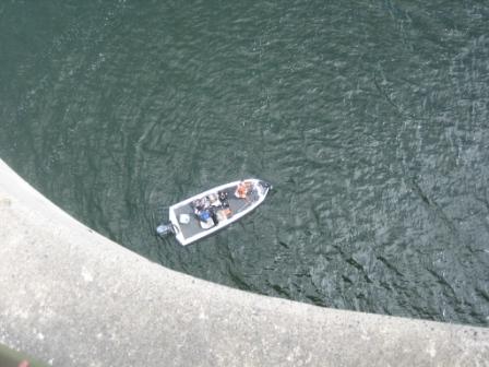 11:18 橋の上で休憩? 途中、檜原湖にかかる橋の上で休憩? 橋の上から見下ろすアイスエイジさん。 下には1艘のバスボートが・・・ 実はアイスエイジさんの釣り仲間の井上さんがバス釣りにきていました。 さっき、アイスエイジさんは井上さんと携帯でやりとりをして、この橋の下で待ち合わせをしていました。 (デジカメで撮ると間近の橋のコンクリート部分が曲がって写るんですね。) |