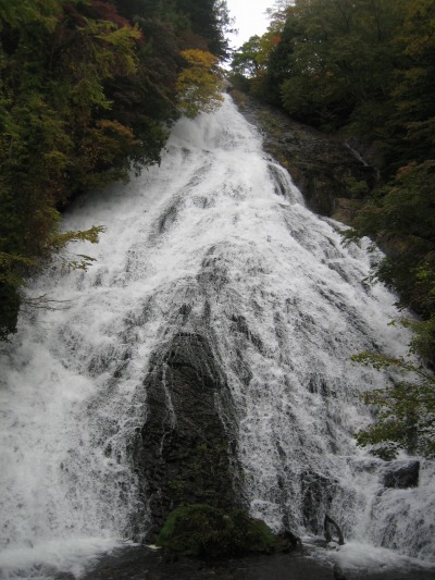 10:49 下側から 今度は、竜頭の滝の下側にきました。 下側から写真を一枚。とっ。 後から、見たら他の人の帽子が被ってました。 紅葉のベストタイミングの今、竜頭の滝周辺は沢山の人で溢れかえっていました。 |