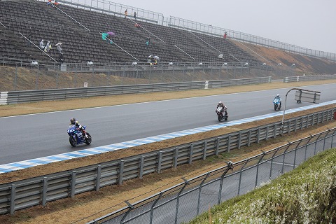 17:08 レース終了 今日のレースがすべて終了しました。 結局、今日一日冷たい雨が降り続きました。 そんな天気もあってか、残念ながら来場者数はわずか約6,000人だったそうです。 2年ほど前からU-STREAMでの全日本ロードレースの放映が始まり、無料で見られる様になりました。 そのときは、ピットでヘルパーなどをしていたこともあり、「ネットで無料で見られる様にしたらお客さんが減っちゃうよね。」と思っていましたが、ちょっと考えが違ったようです。 WSB(ワールドスーパーバイク)はネットで無料で視聴することができますが、ネットで見ていて、もし日本で開催されるのであれば、見に行きたいと思う面白さがあります。 そういった意味で、全日本も直接見に行きたいようなレースを期待しちゃいますね。 |