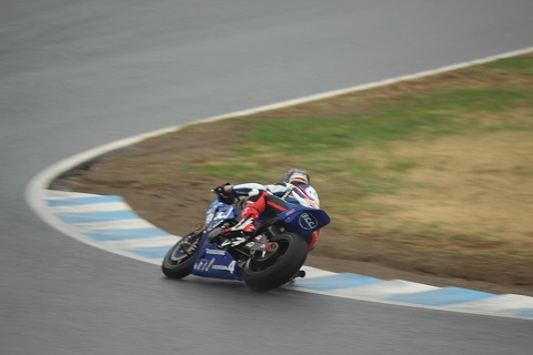 15:38 レーススタート JSBのレースがスタートしました。 レースは2周減算の16周回で争われます。 そして、ダウンヒルを一番にやってきたのは#4の秋吉選手。 相変わらず切れた走りで、中須賀選手や加賀山選手が本調子でないこともあり、他の選手と比べると一枚上手の走りですね。 |