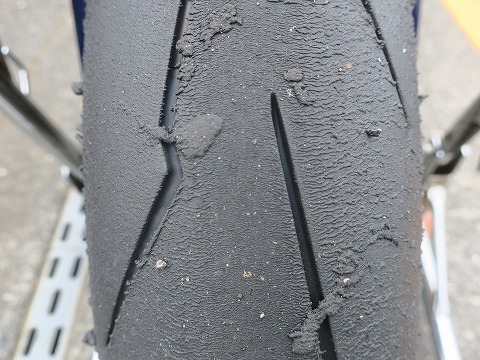 11:31 走行後の リヤタイヤ。 左は残ってるけど、右コーナーが多いので、右側はほぼ終了。 もう1本くらい走れそうですが、ここでタイヤ代ケチって転んだら、余計高いもんについちゃう。 (サーキット走っていると良く言うけどね) 交換した方がいいね。 走行後のエアー圧は、5kPaくらい上がる感じ。 今の時期なら、走り始めでもう少し下げてもイイかもしれないですけど、自分のタイムだと関係無いかな。(笑) |