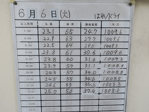12:17 コンディションは 腕章を返却したら、コースインゲート脇のコンディションボードに。 今日のコンディションは・・・・。 1本目の9時30分からの走行の時は 9:30 気温 23.8℃ 路面温度 31.6℃ 10:00 気温 23.9℃ 路面温度 31.1℃ 2本目の11時からの走行の時は 11:00 気温 24.5℃ 路面温度 34.6℃ 11:30 気温 24.6℃ 路面温度 35.6℃ この時期だと晴れちゃうと路面温度が40℃を越えちゃいますが、最高で35.6℃は良いコンディションだったんですね。 気温も、25℃を越えてなかったし。 エンジンは冬場ほど力強く回りませんが・・・・。 |