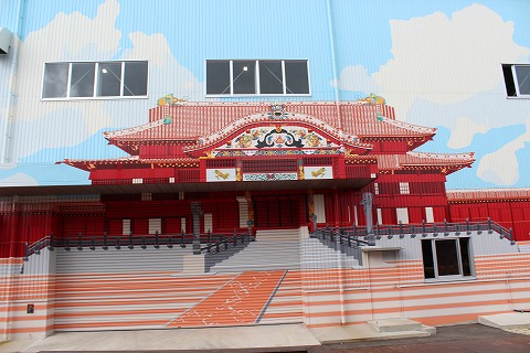 14:54 建物の壁面には 中に入ると、プレハブの建物の壁面に、正殿のイメージが書かれています。 |