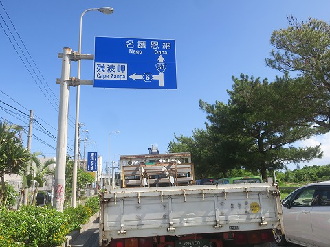 9:29 昨日はここまで 西海岸道路はところどころで自動車専用道になって、原付二種のスクータは通行不可。 google map には原付二種の設定が無いので、ルート案内通りには走れません。 仕様がないので、途中から国道58号線に入り、名護方面を目指します。 国道58号線を北上して、昨日訪れた残波岬との交差点までやってきました。 ここから先の国道58号線は昨日走ってません。 美ら海水族館があるのは本部町、その手前にある名護までは国道58号線が接続されています。 |