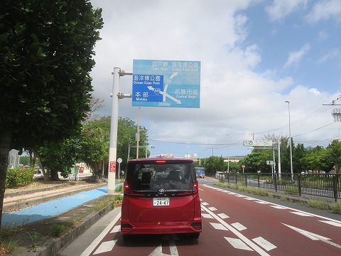 10:59 道路看板に 国道449号線を北上し、美ら海水族館に向かう沖縄県道114号線との交差点までやってきました。 那覇からずっと”海洋博公園”なり”美ら海水族館”が道路看板に出ているので、道に迷うことはありませんね。 この先の交差点を左折します。 |