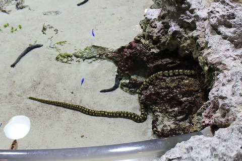 11:27 何これ 中に入るといきなりあるのが小さな水槽群。 「うわぁっ! 気持ちわりい。」 ”オオイカリナマコ”って言うらしい。 ヘビじゃ ないのね。 よく伸びると3mにもなるらしいです。 海に潜ったら、こんなのが目の前に現れたら、自分ならパニック起こすね。 こんなのが現れたらイヤなので、自分はスキューバとかはやりません。 いきなりインパクトのある展示物からスタートしました。(笑) |