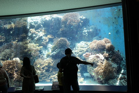 11:55 巨大水槽に ようやくジンベエザメのいる巨大水槽までやってきました。 巨大。 容量は7,500m3あるそうで、深さが10m、幅35m、奥行き27mの大きさだそう。 正面は、ガラスではなくてアクリル製。 高さが8.2m、幅22.5mとほぼ水槽の片面がアクリルの窓で出来ています。 そして7,500t 以上ある水の圧力に耐える厚さは60cmあるそうです。 ちなみにこのアクリルパネルの総重量は135t と、ちょっとしたトリビア。(笑) |