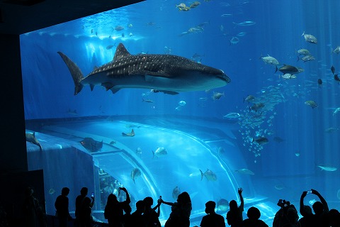 11:56 ジンベエザメ なんて巨大水槽を見て「凄いなぁ。」なんて思っていたら、ジンベエザメが回遊してきました。 「デカいねぇ〜!」 8mほどあるらしいです。 ゆっくりと泳ぐ姿は貫禄ですね。 ジンベエザメは日本の他の水族館でも見ることができるらしいですが、この大きさのジンベエザメを見ることが出来るのは、ここ美ら海水族館だけのようです。 |