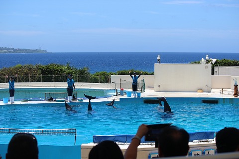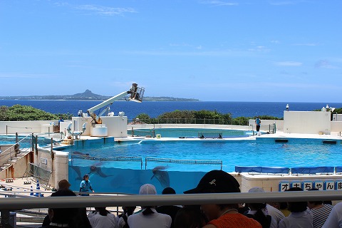 12:51 オキちゃん劇場に 1時からイルカのショーがあると言うので、イルカのいる”オキちゃん劇場”までやってきました。 (オキちゃんはここのイルカの愛称らしい。) 10分前だけど、お客さんが入り始めているので、席に座ります ここも美ら海水族館とは別の施設(?)で、無料で観覧することができます。 |