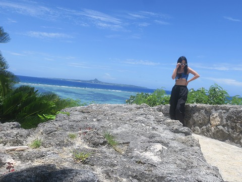 12:32 借景? 水族館から外に出ると、目の前に海が広がっています。 きれいです。 沖に見えるとんがり帽子の島は、伊江島と言うらしい。 いい風景なので、写真を撮ろうと思ったけど、先の人がスマホで(おそらく映える写真を)撮っていて動きません。 面倒臭いので、借景じゃないけど写真一緒に入ってもらいました。(笑) 映える。(笑) |