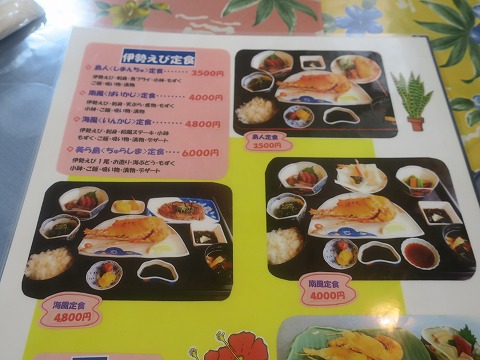 18:54 注文は さて、何を食べましょうかね。 メニューには、居酒屋じゃなくてレストランなので、単品メニューもありますが基本はセットや定食が並びます。 頭に”伊勢えび定食”が出ています。 伊勢えびが獲れるみたいで、例年4月から7月が禁漁期で8月から解禁みたいです。 それでは、王道(?)の伊勢えびを食べてみましょうか。 注文したのは、4種類ある伊勢えび定食で一番安い”島人定食”にしました。 (お昼食べ過ぎたんでね) |