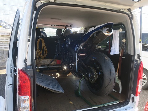 10:44 積込み中 とりあえずCBRを積込んで片付け中。 夏場だと、エンジンが熱々なので、あんまり早く積込むのは躊躇しちゃうけど、もう寒い季節になったので、カイロ代わりになります。(笑) 後は、備品とかの入っているコンテナ ボックスやガソリンの携行缶を積込みます。 |