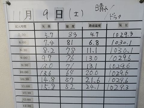 10:55 コンディションは 次の順番は、コースインゲート脇にあるコンディションボードの確認。 今日のコンディションは。 1本目の8時からの走行の時は 8:00 気温 7.4℃ 路面温度 6.8℃ 8:30 気温 8.2℃ 路面温度 11.1℃ 2本目の9時40分からの走行の時は 9:30 気温 12.0℃ 路面温度 13.1℃ 10:00 気温 13.6℃ 路面温度 20.0℃ 1本目は気温一桁でしたね。 路面温度もそれなり。 2本目は気温は10℃台前半でしたが、晴れている割には路面温度が上がってませんでした。 サーキット側の温度を計る場所が日陰だったのかな。 20℃もあれば、気にしないで走っても大丈夫だと思うんですが。 これから季節が進むと、気温は一桁の前半だったり、路面温度も一桁台になるんでしょうね。 |