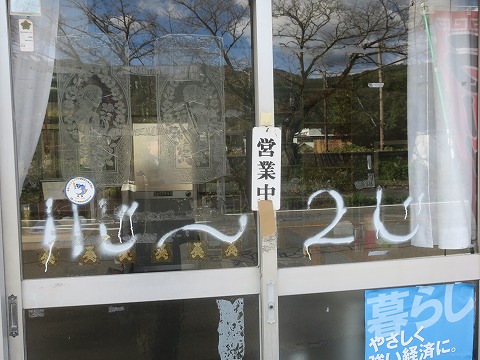 11:49 営業時間は お代を払ったら店の外へ。 入口のガラスに白のスプレーで何か書いてあると思ったら”11じ~2じ”の営業時間。(笑) 確かにね。 この辺りじゃ、看板屋さんも、この辺りじゃ近所になさそうですしね。 それでは、午後もツーリングを続けます。 (つづく) |