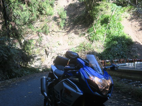 12:06 崩れてますが・・・ 国道362号線を離れ2kmちょっと、ガッツリとのり面が崩れてます。 山側の道路端にはA型バリケードが設置されていますが、通れるんですねぇ。 通しちゃうんですねぇ。(笑) まあ、普段であれば崩てこないから大丈夫だろうけど、ちょっと雨が降ったら怖いですよね。 |