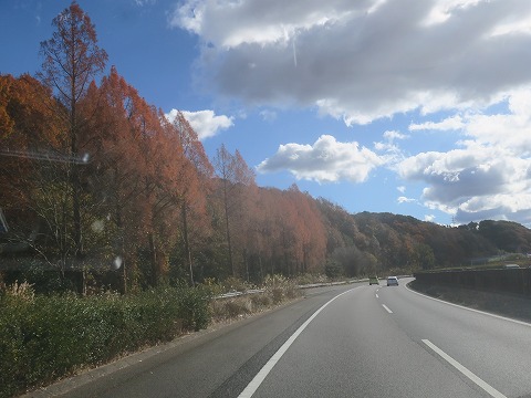 11:19 遅い紅葉 名古屋を過ぎて、高速は名神道から東名に入り東進を続けています。 愛知県の岡崎市辺りまで来ると完全に太平洋側の気候。 道路脇の木々が遅い紅葉で色づいています。 |