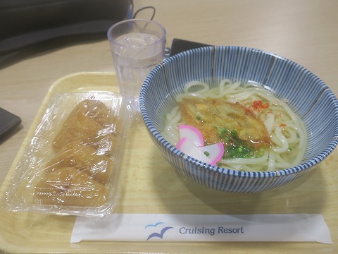 19:28 夕食を 7時半近くになって売店が開いたので、何か胃に入れます。 お昼もラーメン一杯だけしか食べていなかったので、お腹が空きました。 食べたのは”ごぼうかき揚げうどん”と”いなりずし”。 メニューの選択肢は少なくて、他にカレーとかがあったと・・・。 福岡県なので、腰のないうどんを期待していたのですが、讃岐うどんほどじゃありませんが、意外に腰がありましたよ。(笑) |