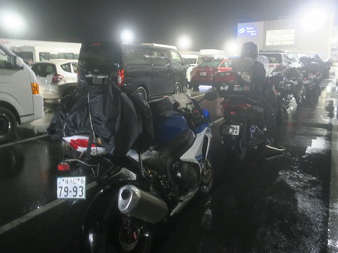 22:50 バイクの列に 11時前になって、バイクの列に並びます。 到着したときよりも雨は小雨になって、風もほぼ止みました。 かと言って、カッパを脱げるほどではありませんけど。 雨の中、突っ立って乗船開始を待ちます。 (このあたり、どうにかならないかな?と思いますね。 バイクの待合い場所だけ屋根を付けてもらうとか・・・・。) 場内のアナウンスでは、乗船の準備が遅れているとのこと。 雨の中、待ちます。 寒くないから、まだ耐えられます。 |
