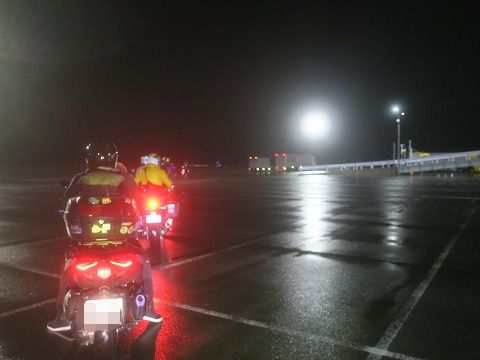 23:53 乗船が始まる 日付けが変わる直前になって、バイクの乗船が始まりました。 1時間近く遅れているようです。 雨はほぼ止みましたが、今さらカッパを脱いでもね。 |