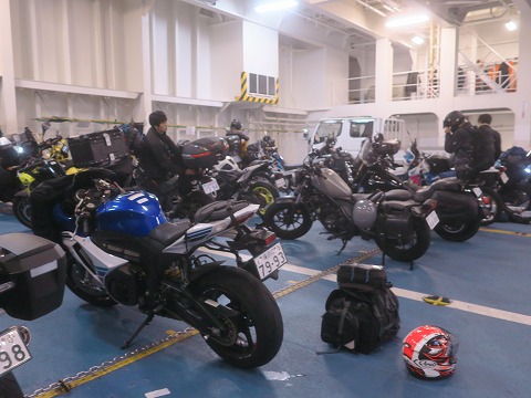 20:33 車両甲板に 荷物を持って車両甲板に下りてきました。 みんなそそくさとバイクに荷物を積込んでいます。 |