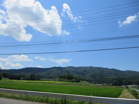 9:40 蔵王連峰を しばらく進むと国道は水田の中を走ります。 ちょっと退屈なので、右手に見えている山の写真を収めておきましょう。 あの山群は蔵王連峰じゃないかな。 5月のゴールデンウィークくらいに来ると、まだ雪が残っていて奇麗でしょうね。 たぶん。 |