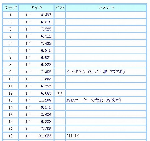 10:05〜10:25 B2クラス 10時5分になって、2本目の走行が始まりコースインします。 前回、R11を初めて履いて、しかも適正なエアー圧よりも高かった、にもかかわらず1分5秒3が出ました。 ので、今回はエアー圧も適正に近いので、5秒台には入れたいところですねぇ。 コースインして、徐々にペースを上げたいところですが、最終コーナーの入口、フロントのブレーキを引きずって入っていくところで、チャタリングが止まりません。 ので、早めの緩めのブレーキング。 色々と重心の位置とか変えてみましたが、消えませんね。 なんて、走っていると9周目に、バックストレッチにつながる2ヘアピンのポストでオイル旗が振られています。 落下物は無さそうなので、どこかにオイルが漏れているのかな? 路面を見ても、その痕跡は見当たりません。 2周くらいからオイル旗が出ましたが、その後は引っ込んだので、タイムアタックを継続。 12周目に6秒0。 5秒台まで、もう一息ですね。 で、残念。 13周目にASIAコーナーで転倒車があって黄旗が出されました。 当然、ペースダウン。 3周の間、黄旗が提示されまひた。 16周目には転倒車が片付けられて、黄旗は引っ込められて、タイムを上げます。 けど、急にはタイム上がりませんよね。 流石に、暑くて疲れも出てきたし。 で17周回ったところで、メインポストでチェッカーフラッグが振られて、今回の走行は終了です。 結局、5秒台に入らず、前回のタイムを更新出来ませんでした。 (-_-;) |