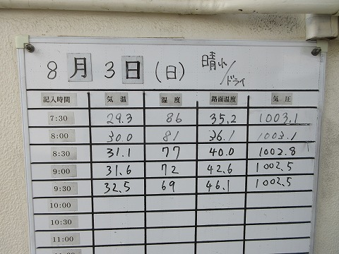 9:34 2本目のコンディションは 流石に暑くなってきたので、2本目の走行前にコンディション ボードを確認。 9時半の時点で、気温32.5℃、路面温度 46.1℃。 46.1℃かぁ〜。 流石に、タイヤが垂れてくる温度ですね。 気を付けて、走らないとね。 |