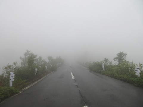15:00 志賀高原に向けて 国道299号線に入ると完全にガスっちゃって、霧の中を走行。 この写真はまだ視界が良い区間。 悪い場所だと、10mも視界が効かないので、危なくて写真を撮っている暇がありませんでした。 まだ3時だって言うのに、夕方の雰囲気ですもんね。 標高2,000mを越えると流石に寒いです。 |