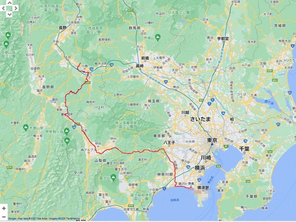 | 午後の道程:東御市〜千曲ビューライン〜中部横断道〜蓼科スカイライン〜白樺湖〜南諏訪 IC〜中央道〜圏央道〜茅ヶ崎海岸 IC〜横須賀:300.96km | |
