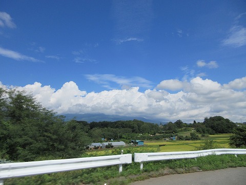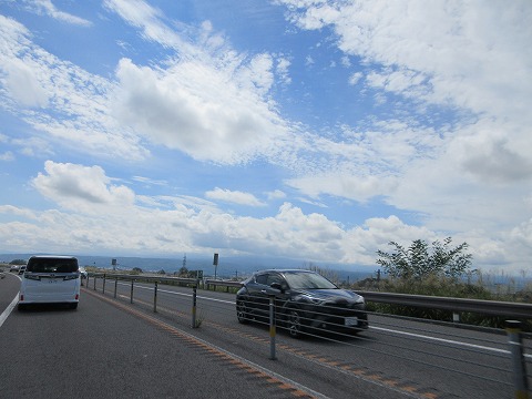 11:52 中部横断自動車道で 中部横断自動車道を南下中。 前方に八ヶ岳連峰がありますが、ここも上の方は雲に隠れて見ることができませんでした。 晴れてはいるけど、雲多め。 |