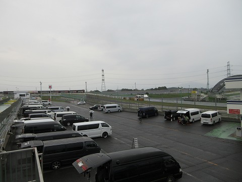 7:01 いつもの場所は 券売所からパドックを眺めると、台数少なっ! 左手のピット側はほぼほぼ埋まっていますが、いつも自分が駐めている右手のS字裏は数台しか駐まってませんね。 |