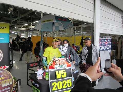 ピット裏をウロウロしていると、先ほどJ-GP3でのレースで2位、年間チャンピオンになった小野選手が、サポータの人にファンサービス。