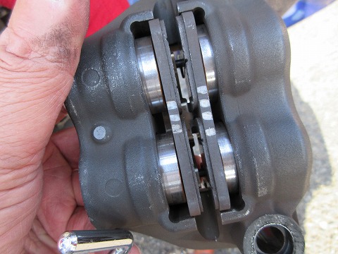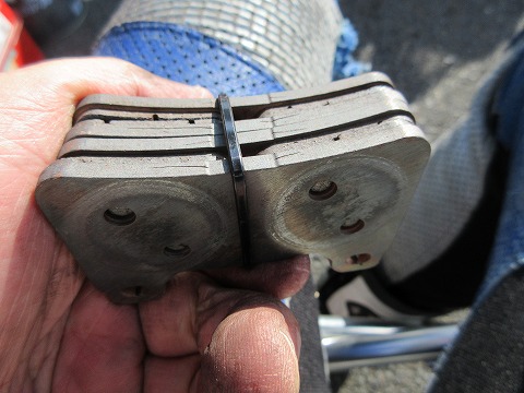 8:54 外したパッド 外して交換します。 左下のパッドは、もう溝が見えないくらいまで減ってますね。 |