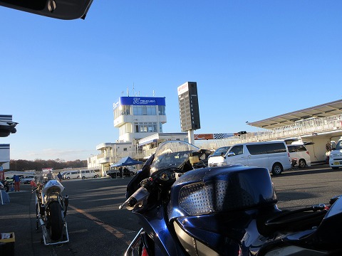 7:43 走行15分前 ぼちぼち総億15分前になるので、ライディング ウェアに着替えます。 自分的には、走行何分前に何をやるか、大体決めてあります。 毎回、何をやるか考えたくないんでね。 それよりも、今日走るのに何をするかを考えるのを優先したいので・・・。 で、今日の走りの課題は・・・・・。 「今シーズン履き始めたBSのR11の寒さに慣れる」 です。 |