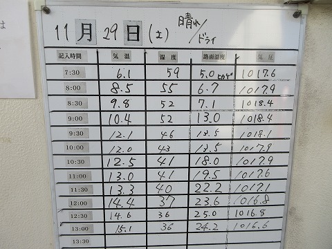 13:25 今日のコンディションは 腕章を返却したら、コースインゲート脇のコンディションボードの写真撮影。 1本目が8:00〜8:20だったので、 8時の気温8.5℃、路面温度6.7℃ 8時半の気温 9.8℃、路面温度7.1℃ 2本目が10:05〜10:25だったので、 10時の気温12.0℃、路面温度13.5℃ 10時半の気温12.5℃、路面温度18.0℃ 3本目が12:10〜12:30だったので、 12時の気温14.4℃、路面温度23.6℃ 12時半の気温14.6℃、路面温度25.0℃ 1本目は路面温度が一桁台と言うことで、グリップ感が希薄、タイヤが固い印象でしたね。 3本目は、路面温度も20℃を越えているので、普通に走れた訳だけど、体の方が切り替えが出来ませんでした。 |