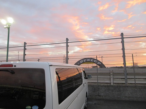 6:47 筑波サーキットに 自宅を出発して、2時間10分で筑波サーキットに到着。 東の空がオレンジ色に染まっています。 ちょうど日の出時刻に到着しました。 普段は4時に出発して6時到着で2時間。 今日は2時間10分なので、少し余計に時間がかかりましたね。 それでは、1コーナー下の地下トンネルを通って、インフィールドに入りましょう。 |