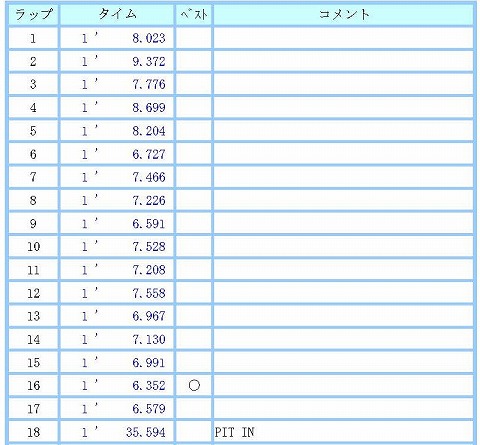10:15〜10:35 B2クラス 10時15分になり、コースインします。 今日は今シーズン最後の走行になるし、寒いこともあるので、無理はせずに丁寧に走って、1年の締めくくりにします。 コースインするときの気温は7℃、路面温度が9℃で両方とも一桁台、タイヤのグリップに十分注意して走ります。 後、リヤタイヤも結構減ってきたので、自分レベルでグリップが落ちるのがわかるのか、集中しながら走ります。 いずれにせよ、1本目の走行で結構寒くてもグリップすることは分かったので、毎度の様に徐々にペースを上げていきます。 1本目のタイムが7秒台だったこともあって、流石に7秒台では帰れないので、頑張ります。 そして6周目に6秒台に入りましたね。 あと、前が詰まったり、クリアラップだったり、前に引っ張ってもらったり、とか覚えてないのよ。 走行後すぐにメモを取っておかないとダメですね。 (転倒とか、黄旗が出たら覚えているけど、それ以外だと中々覚えてられません。 タイムを見ると基本7秒台前半、時々6秒台って感じですね。 そしていつものパターンで、終わりの方16周目に2本目のベスト6秒3。 17周目にチェッカーが出て、この回の走行は終了です。 |