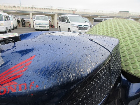 11:20 雨に濡れて パドックの路面も濡れて黒くなってしまいました。 これじゃ、今止んだとしても10分じゃ乾かないな。 3本目の走行は無理ですね。 3走行目のガソリンを買ってこなくて、正解でした。 |