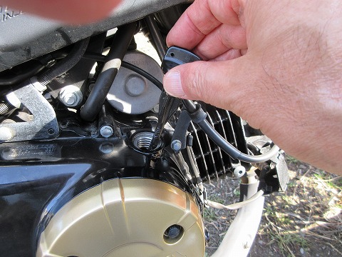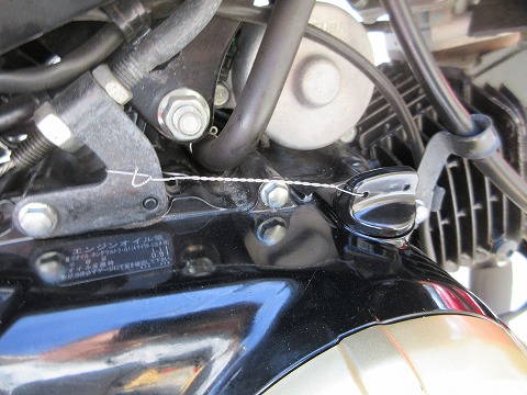 12:02 ワイヤーロックを オイルのレベルが決まったら、最後にフィラーキャップを締めて、締め忘れ確認のためにワイヤーロック。 これで、オイル交換作業は終わります。 |