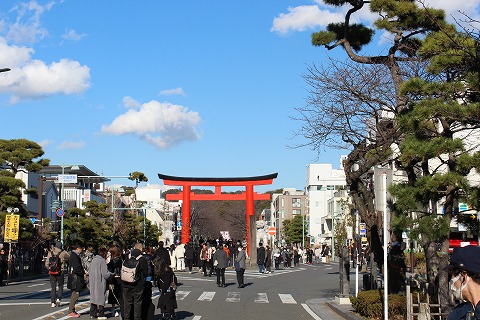 14:00 小町通りは 駅のロータリーに接続している小町通りの入口にある鳥居。 鶴岡八幡宮に向かう商店街。 お土産屋さんと飲食店が並びます。 決して、地元民向けの八百屋とか肉屋とかスーパーとかがあるわけじゃありません。 小町通りは混むので帰りに通るとして、参道の若宮大路を通って鶴岡八幡宮に向かうことにします。 |