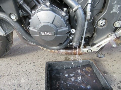 12:11 冷却水を抜く 外に出したのは、冷却水を抜くため。 これから冬本番になるので、冷却水が凍結してエンジンを壊さないように抜いておきます。 車庫の中は零下になることは、ここ2年ほどはないんで、まず零下にはならないんですけどね。 入っている冷却水は、清水さんが入れたので、MOTUL のMOCOOLかな。 |