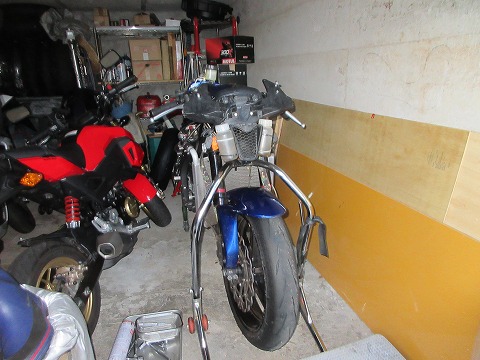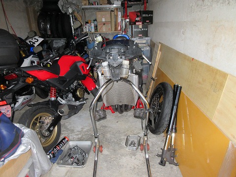 16:35 しばらく放置 と言うことで、フロントフォークを取り外しちゃうと、動かせないので、しばらくこの状態で車庫に放置になります。 |