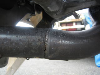 更新済 | 060721 | エキパイにクラック | 20日にBS走行会に行ったとき、暖気中にアイスエイジさんが排気音の以上に気がつきました。 原因を探ってみたら、エキパイのほぼ半周にわたりクラックが入っているのが見つかりました。 アイスエイジさんが取り外してくれて、レーシングサプライに溶接修理を依頼しました。 7月22日時点で修理中です。 |