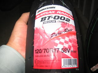 更新済 | 060613 | BSに交換しました | 今まで、タイヤはDUNLOP製を使っていましたが、BSのタイヤのユーザーは、モテギの走行会に参加出来ると言うことで、急きょBSタイヤを購入し、BSユーザーに変身。 でも、写真のところにカーソルを持っていくと、フロントフォークにはDUNLOPのステッカーが・・・ 似非(えせ)BSユーザーと言うのがバレバレです。 |