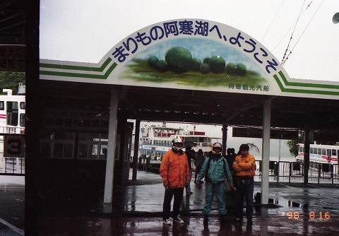 北海道ツーリング2日目は雨でした。 雨の中、釧路を出発して阿寒湖へ。 阿寒湖畔で雨の中、記念撮影。 K君はカッパも持っていなくて、上はジャンパー、下はGパンのままツーリングを続ける。 夏の北海道、雨が降ると気温は15℃前後になりとても寒かった。 そんな中でもK君は元気だ。 自分は、寒いので、朝、出発前に釧路市内のデパートでトレーナーを購入。(なぜ憶えているかって、それは今でも部屋着で使っているからさ!) 当時はフィルム写真でフィルム・現像が高かったから、撮った写真の枚数は少ない。 |
