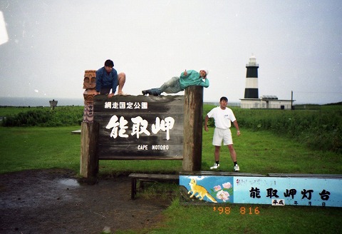 網走刑務所の後は、せっかく北海道にきたんだから、日本では北海道からしか見えないオホーツク海を見に能取(のとり)岬へ。 やっぱ、写真を撮るときは、なんかしないといけないみたいだ。(笑) 当時、訪問先での情報と言えば、観光案内所に行くか、ツーリングマップルくらいしかないから、網走から近い能取岬を訪れたんだと思う。 訪れた能取岬には、灯台とこの看板しかなかった。 そして、雨のオホーツク海は太平洋と変わらなかった。 この後、宿に戻り、自分は同期と女満別に飲みに出かけた。 |