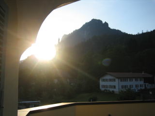 6:30 ホテルの窓から ホテルの窓から射し込む朝陽で少し早く目が覚めました 気がつけば、ノイシュバンシュタイン城の背後から、陽が昇っていました。 |