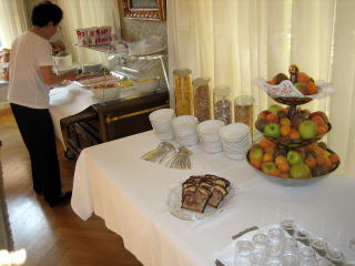 7:41 朝食 ドイツのホテルは大抵どこも朝食付でしかも選び放題、食べ放題なのでとてもお得感があります。 (以前、スイスに行ったとき、朝食はクロワッサン2,3個にコーヒーのみと言うことがあり、ビックリしましたが、それがスイスでは標準的と聞いて2度ビックリでした) |